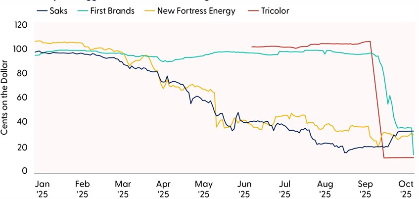 However, this strength masks a growing fragility in the broader credit landscape, particularly among lower-rated corporate borrowers. A series of recent collapses, including those of Saks, New Fortress Energy, Tricolor Holdings, and First Brands Group, have inflicted losses of 60% or more on investors, prompting worries that these kinds of events may not be one-offs. Jamie Dimon, CEO of J.P. Morgan Chase, recently noted that these types of credit events, while seemingly unrelated, are like cockroaches and “when you see one cockroach, there are probably more.” And perhaps presciently, his warning came days before a few regional banks disclosed loan fraud losses, putting downward pressure on both stock and bond prices (and upward pressure on bond yields). While seemingly unrelated to the regional banking crisis that took place in 2023, when Silicon Valley Bank (SVB) filed for bankruptcy protection after it lost a quarter of its deposits in a single day (it lost another 62% of deposits the following day before it was closed by regulators), fears remain elevated, particularly among regional lenders.