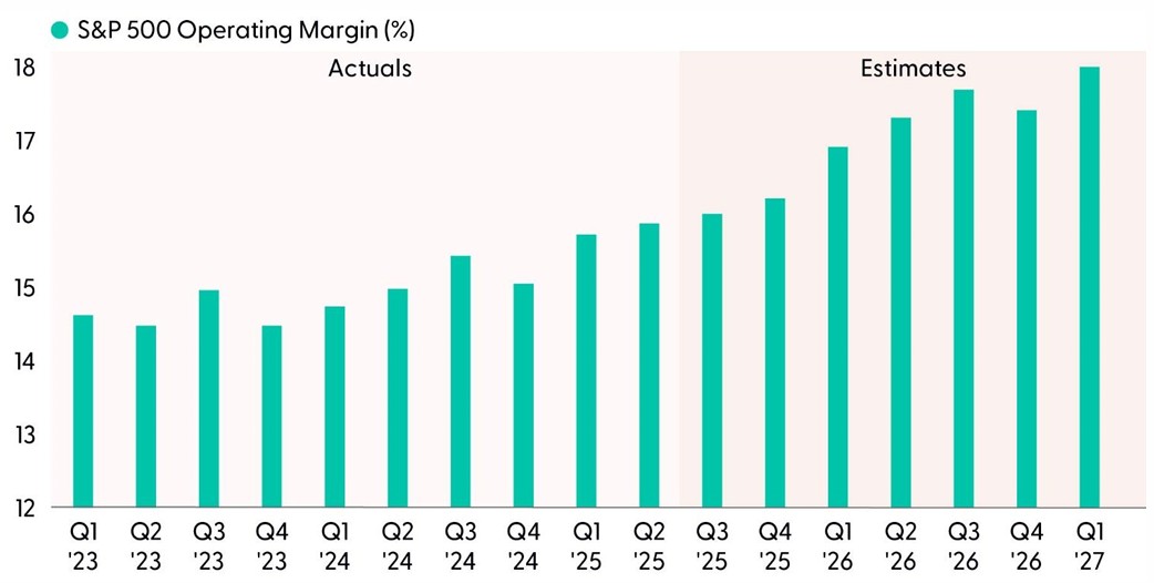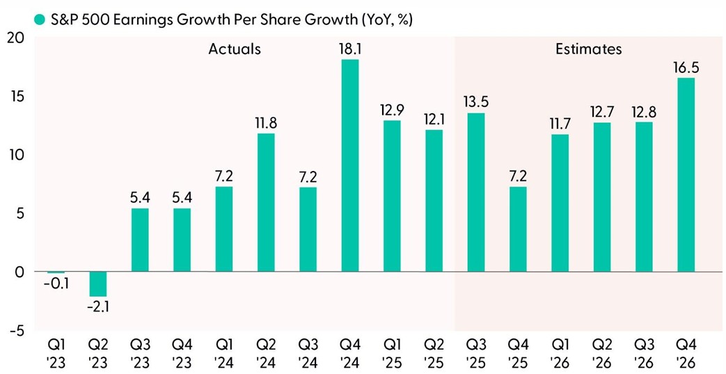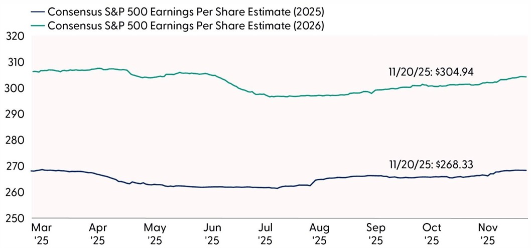 Third quarter earnings season continued to highlight corporate America’s resilience during periods of uncertainty. More tariff effects were felt last quarter and companies managed to not only meet the bar but also raise guidance, helping lift earnings estimates for both 2025 and 2026. The Mag Seven continues to be the dominant force behind earnings growth and AI investment is setting the stage for broader productivity gains across sectors. With the bulk of tariff-fueled margin pressures moving to the rearview mirror, the effects on U.S. companies have been less than initially feared, and many companies have proven adept at offsetting these costs through operational efficiencies.