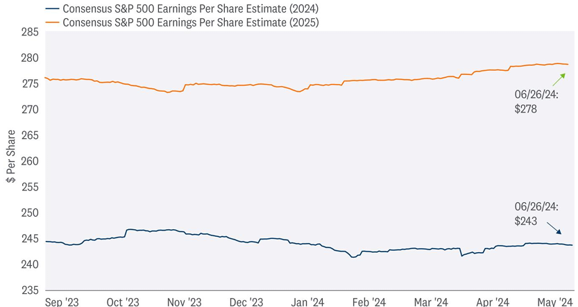 That leads to our 2024 and 2025 estimates, which we will raise in our 2024 Midyear Outlook publication, due out on July 9 (estimates currently sit at $235 and $250, respectively, both reflecting growth in the mid-to-high single digits). Over the next year, earnings growth rates are expected to get a boost from a resilient but slowing economy, AI investment, and easy comparisons in the healthcare and natural resources areas.