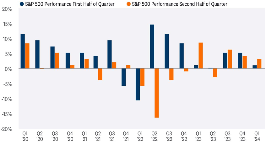 As illustrated in the chart below, in recent years, stocks have done better during the heart of earnings season (from quarter end through the middle of the next month) than they have during the off weeks. We understand some companies report outside of this window, including NVDA, but to keep the time frames equal and keep the analysis simple, we split quarters into halves. Since 2020, the S&P 500 has gained an average of 4% during the first half of the quarter when the bulk of earnings are released, compared to flat average performance during the second half of the quarter when fewer companies report.