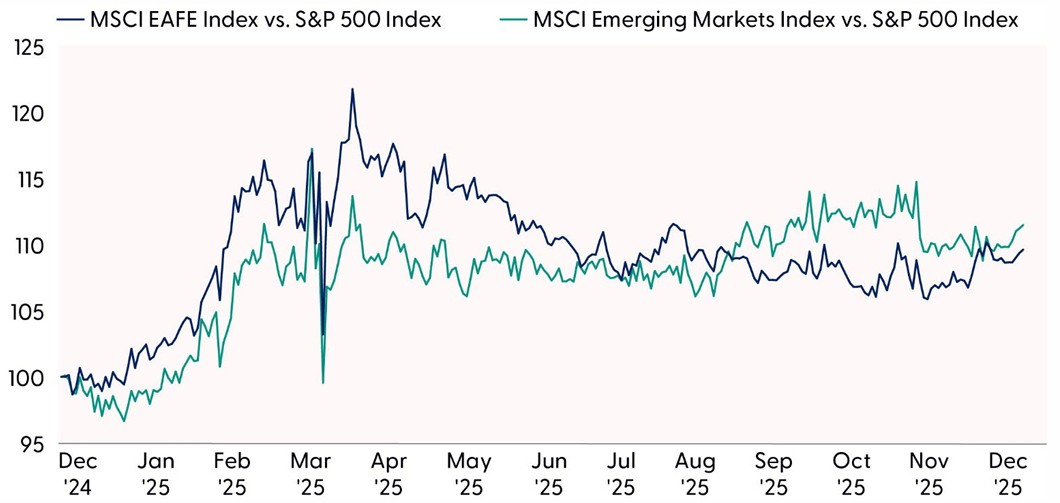 Favoring U.S. Over EM Early in 2025 — Miss. In perhaps our biggest miss of 2025, emerging market (EM) equities dramatically outperformed the S&P 500 during the first four months of 2025, a period when LPL Research recommended an underweight position. The STAAC’s cautious stance was driven primarily by U.S.-China trade tensions ahead of the Trump administration’s tariff announcements, but a weaker dollar, AI, and watered-down tariffs proved to be powerful drivers of EM stock performance. EM outperformed U.S. equities before and after our May upgrade, and the MSCI EM Index ended the year with an impressive 34.3% return, boosted by a 9% drop in the U.S. dollar based on the DXY U.S. Dollar Index. STAAC’s EM equity stance remained neutral as 2026 began.
