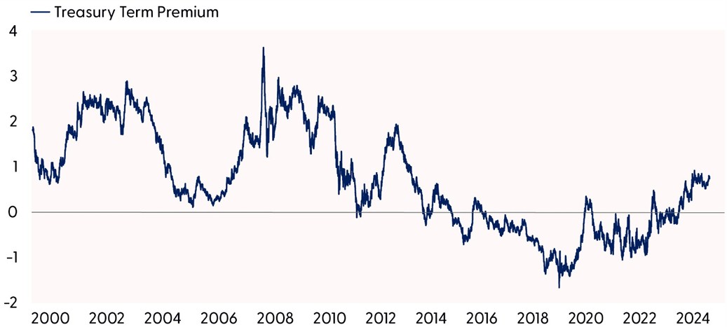 Disclosures: Past performance is no guarantee of future results. The Treasury term premium is the additional compensation required by investors who buy longer‑term Treasury securities.
