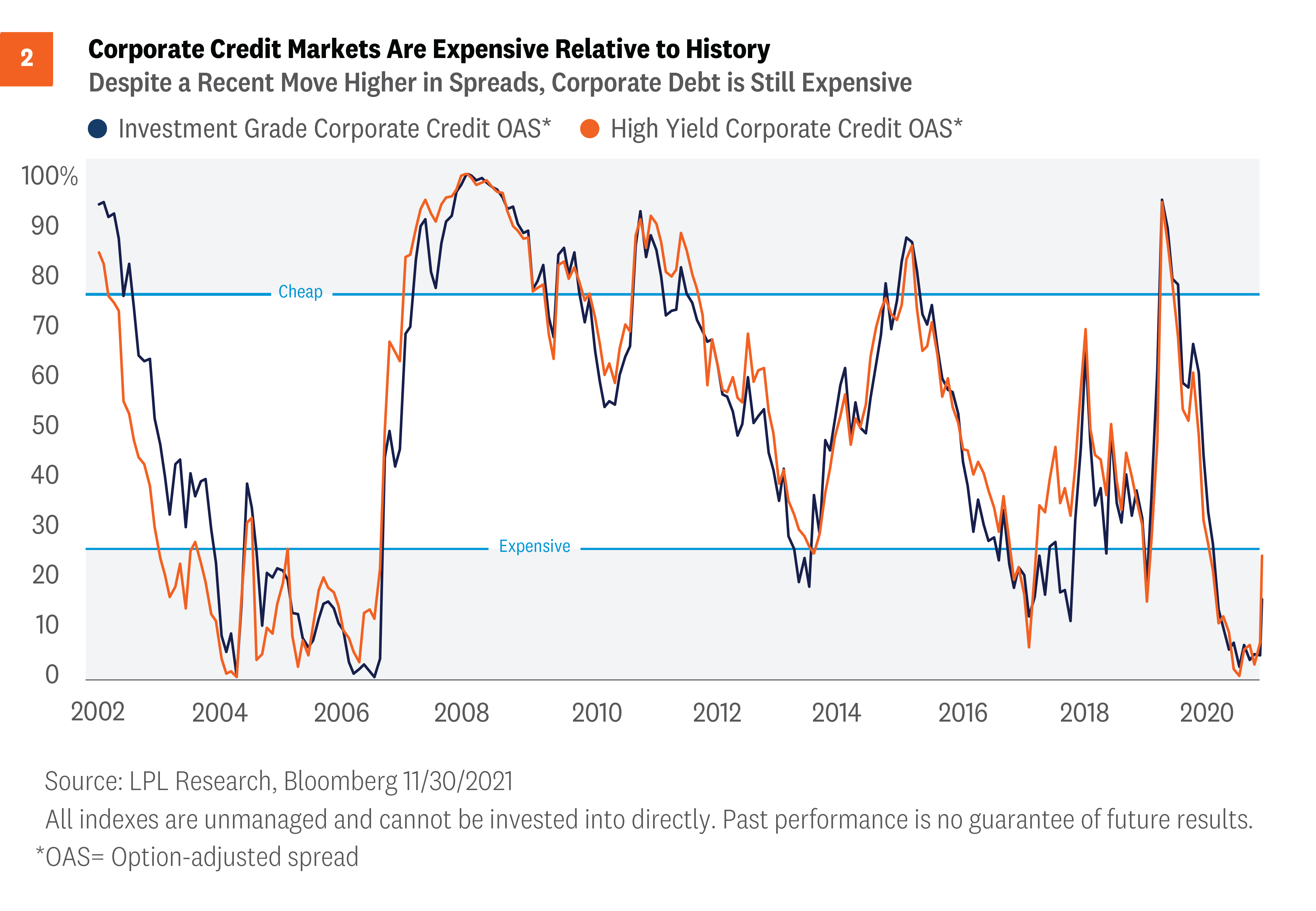 As interest rates increased during 2021, investment-grade corporate debt was negatively impacted as the sector, perhaps surprisingly, is among the most interest rate sensitive fixed income asset classes. U.S. high-yield investors, however, were rewarded for owning riskier debt. During the year, credit risk was rewarded as opposed to interest rate risk. As the economy transitions into mid-cycle, credit investors need to be more cognizant of downside risks. While the economy should still be conducive to credit risk and corporate balance sheets generally remain in good shape, credit spreads are among the lowest they’ve been in years, which means compensation for the added risk of corporates is low.