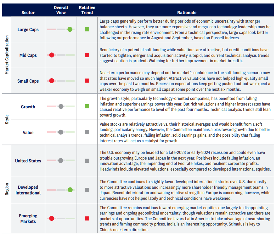 - The Committee favors large cap stocks over their smaller brethren ahead of a likely economic slowdown toward the end of the year.