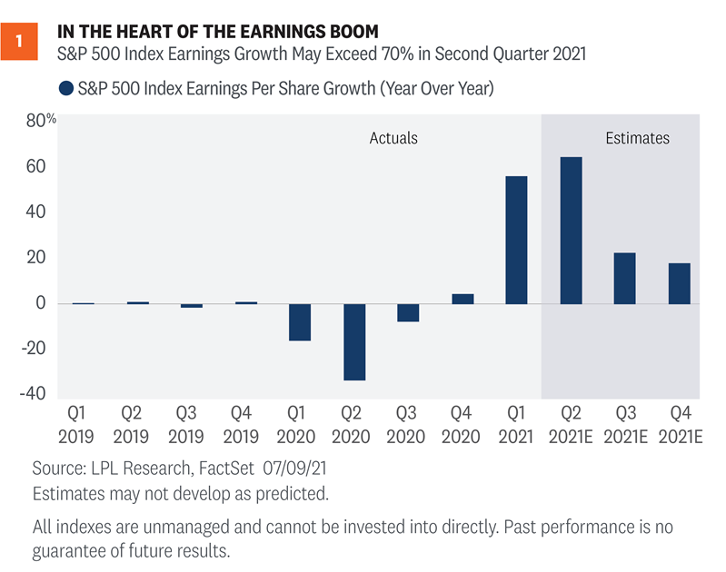 We expect a strong second quarter earnings, but so do most market participants. With expectations high (again), it won’t be easy for companies to handily clear the bar like they did the past several quarters. We also recognize that stock valuations are elevated, so disappointments will likely be punished. Stocks need strong earnings to come through to justify those valuations, and we think we’ll get them. Our year-end S&P 500 fair value target range is 4,400—4450, based on a price-to-earnings multiple of 21.5 and our S&P 500 2022 earnings estimate of $205, which we think may be achievable even with a potential increase in the corporate tax rate next year.